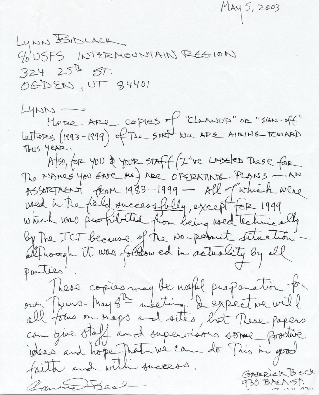 Meeting Preperation Letter, May 5, 2003